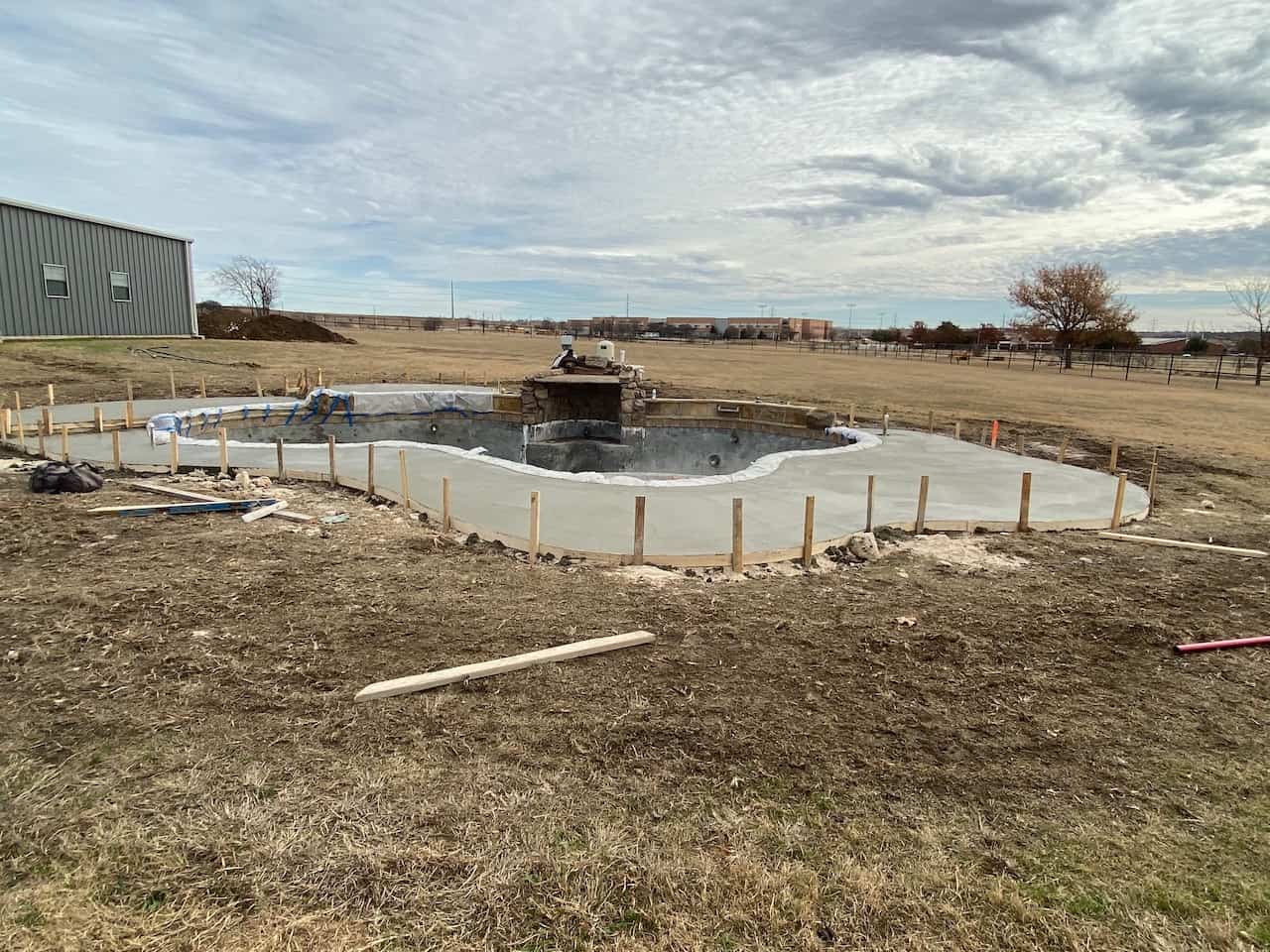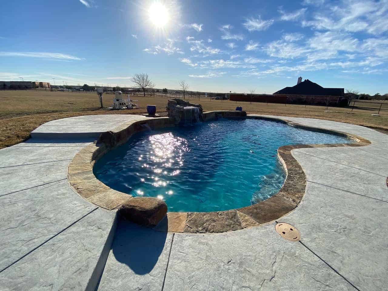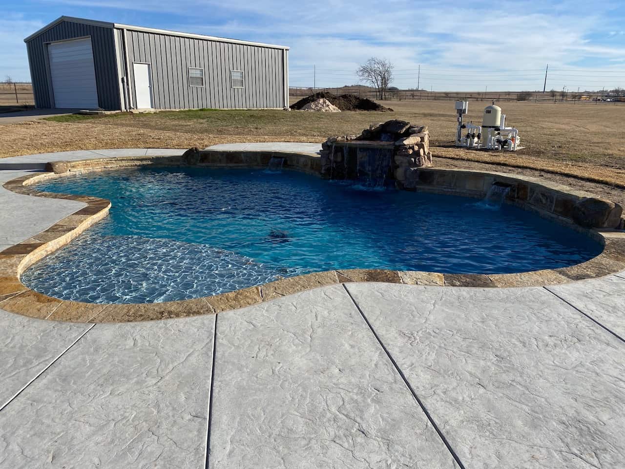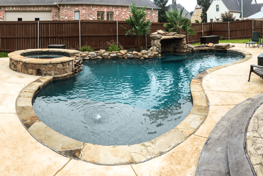 The homeowner wanted to bring an oasis feel to their country style home. They requested a freeform style play pool with a rock grotto water feature and extra bench seating. We met with the homeowner several times to be sure we had a clear vision of what they wanted. We did a 3D rendering of the project and shared it with the homeowner. After getting their approval, we sprayed and marked out the layout of the pool in the backyard, matching the rendering. This allows homeowners to envision the full backyard transformation. We designed, constructed and completed the design to meet their specifications.