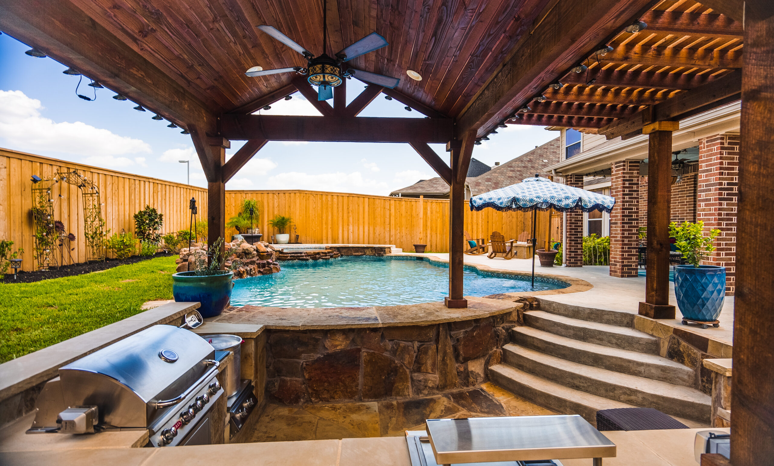 When you plan your outdoor space, you must be mindful of the placement of your outdoor kitchen relative to your pool. Contact with moisture, pool chemicals, and sun exposure can age the look of your outdoor kitchen. When planning your outdoor kitchen, the best placement is underneath a pergola or cabana and out of direct sunlight, as well as weather exposure.
