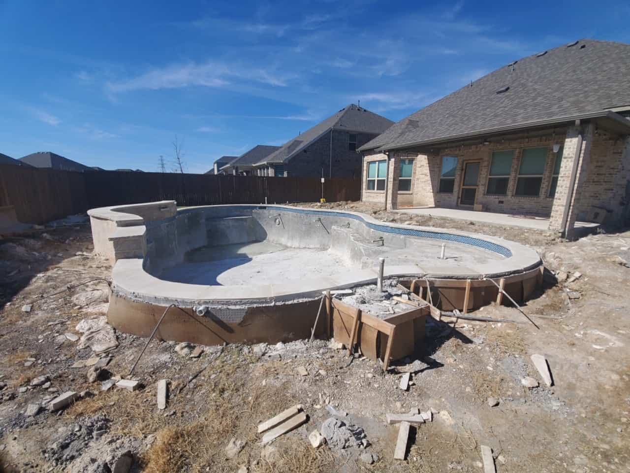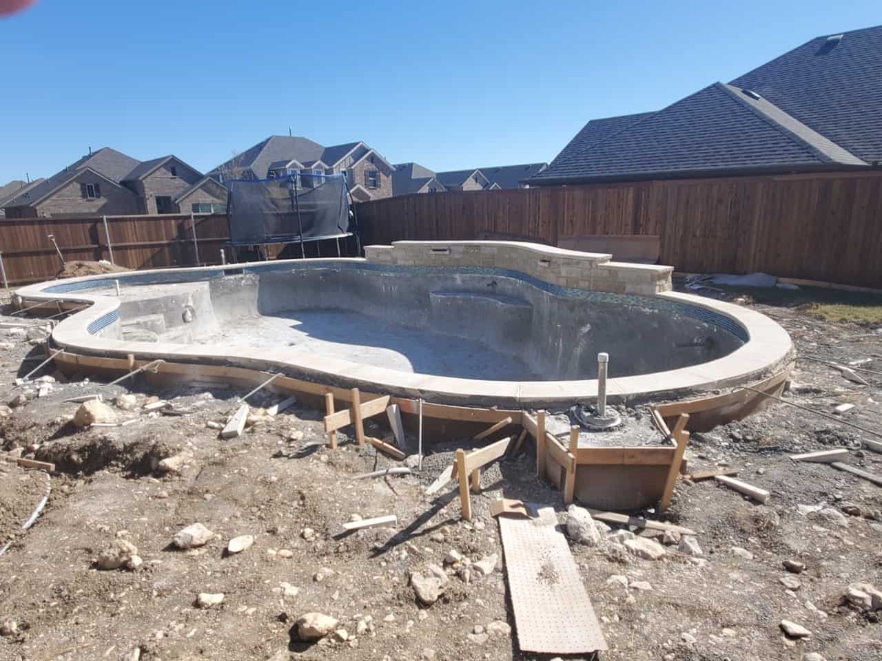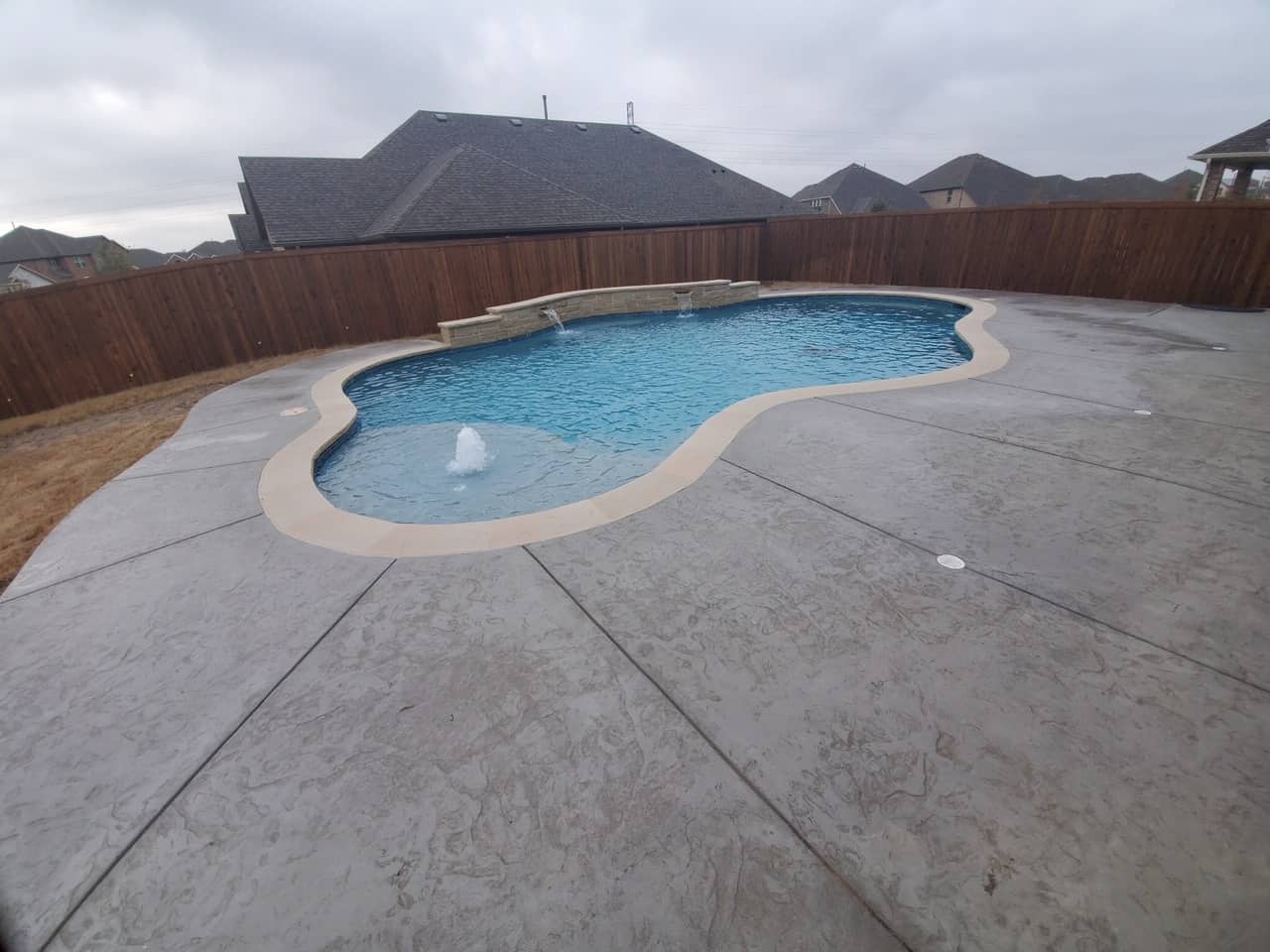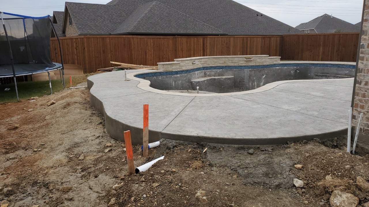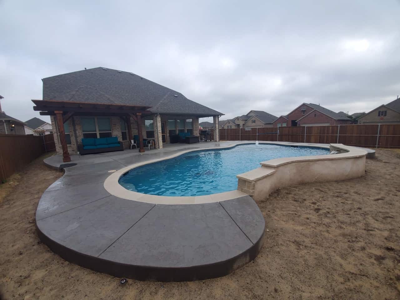 We recently completed a new pool installation in Fort Worth. The homeowners of this featured pool wanted a freeform play pool with a raised beam water feature. They also wanted a lot of extra seating area, as well as a pergola for shade from the Texas heat. It’s details like the seating and a pergola for shade that maximize your use of your new pool. These are features you want to be sure to incorporate in your new build, rather than to try to add them down the road.